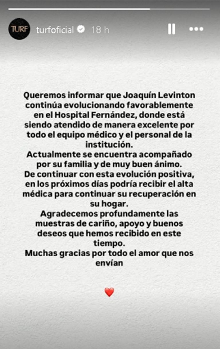 El grupo Turf, informó mediante un comunicado el estado de salud de Joaquín Levinton y explicaron que el músico continúa evolucionando de manera “favorable”, tras haber sufrido un infarto, y que podría recibir el alta en los próximos días.