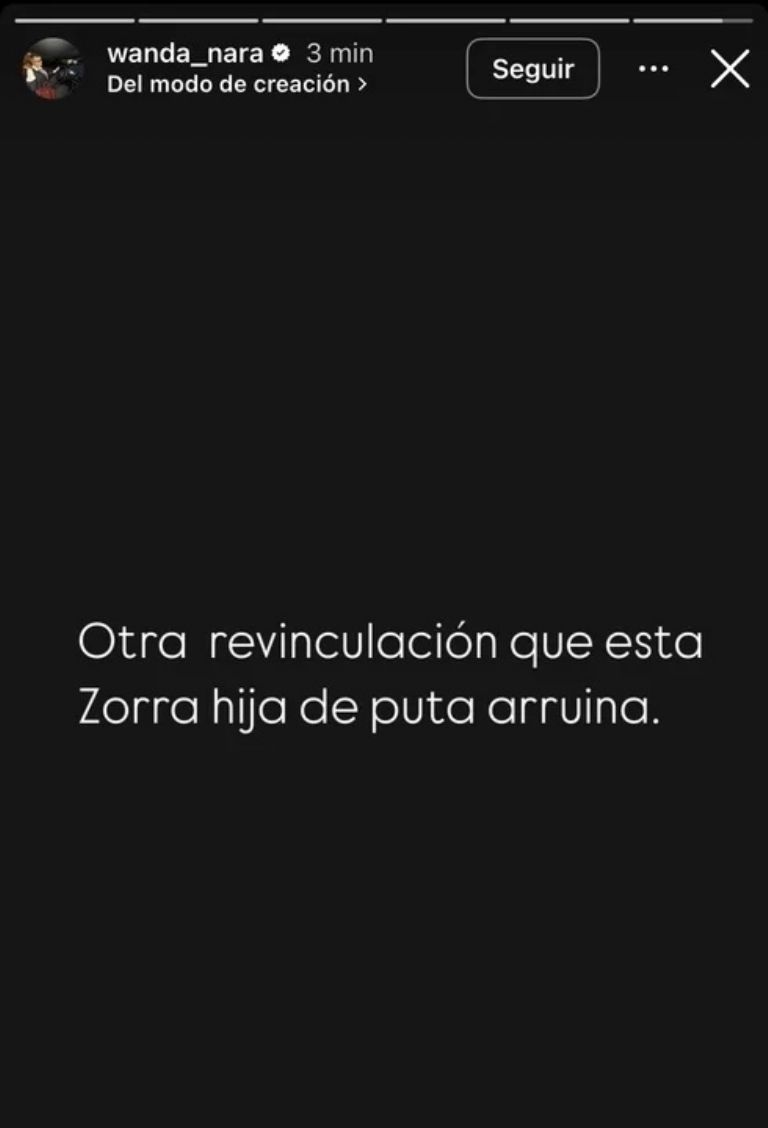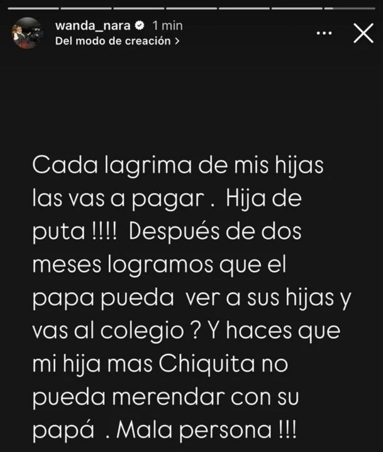 “Otra revinculación que esta zorra hija de puta arruina”, disparó Wanda Nara en sus redes sociales. En otra historia, sumó más detalles. “Cada lágrima de mis hijas se las vas a pagar. Hija de puta. Después de dos meses logramos que el papa pueda ver a sus hijas ¿ y vas al colegio? Y haces que mi hija mas chiquita no pueda merendar con su papá . Mala persona”, señaló.