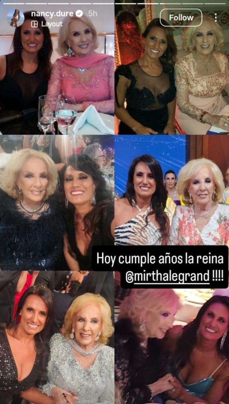 Por su parte, Nancy Duré compartió un collage con distintas fotos junto a Mirtha tomadas en eventos, galas y estudios de televisión, y en su historia destacó: “Hoy cumple años la reina @mirthalegrand”.