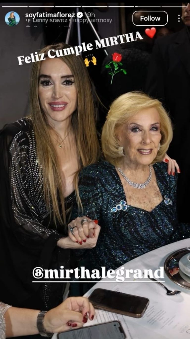 También se sumó Fátima Florez, quien publicó una foto tomada durante una cena: “Feliz cumple Mirtha”, escribió junto a un corazón, aplausos y una rosa roja, etiquetando a la diva.