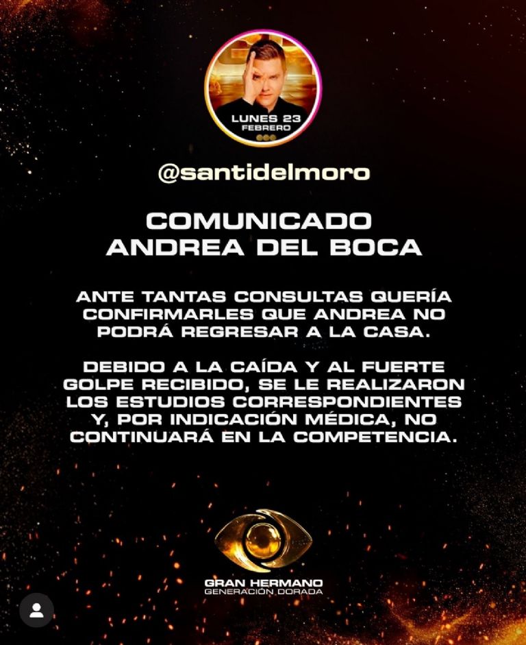 “Ante tantas consultas quería confirmarles que Andrea no podrá regresar a la casa”, lamentó Del Moro quien también afirmó que la decisión había sido tomada por indicación médica.