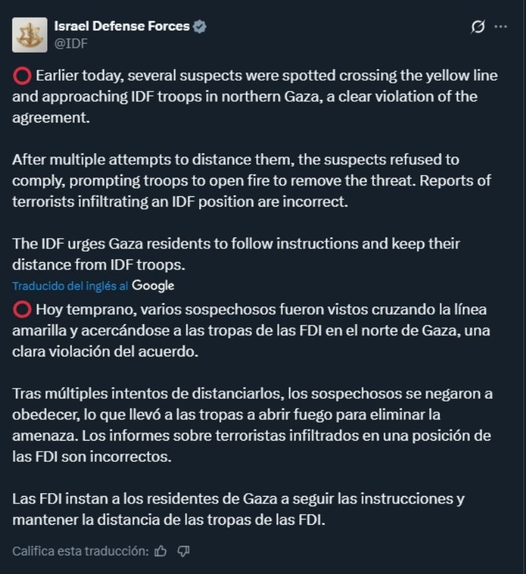 El ejército de Israel indicó en un comunicado que varios “sospechosos” fueron vistos cruzando la “línea amarilla”, que delimita las zonas controladas por Israel según el acuerdo de alto el fuego, y acercándose a las tropas, en lo que calificó como una “violación del acuerdo”.