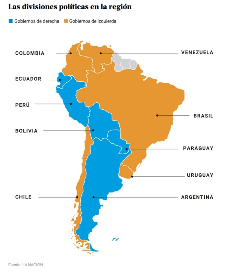 Este giro a la derecha ha tenido matices en otros países: en Perú, el conservador interino José Jerí asumió tras la destitución de Dina Boluarte; mientras que en Ecuador, la transición comenzó con Lenín Moreno y se consolidó con Guillermo Lasso y la posterior victoria de Daniel Noboa. En contraste, Paraguay se mantiene como una excepción, con el dominio casi ininterrumpido del conservador Partido Colorado. Los principales bastiones de izquierda restantes son Brasil (Lula da Silva), Chile (Gabriel Boric) y Colombia (Gustavo Petro), aunque todos enfrentan desafíos significativos, incluyendo bajos niveles de aprobación, desgaste de coaliciones y una creciente polarización, lo que subraya la inestabilidad política generalizada y la dificultad de los oficialismos para sostener el apoyo popular en el actual contexto de crisis y desigualdad.