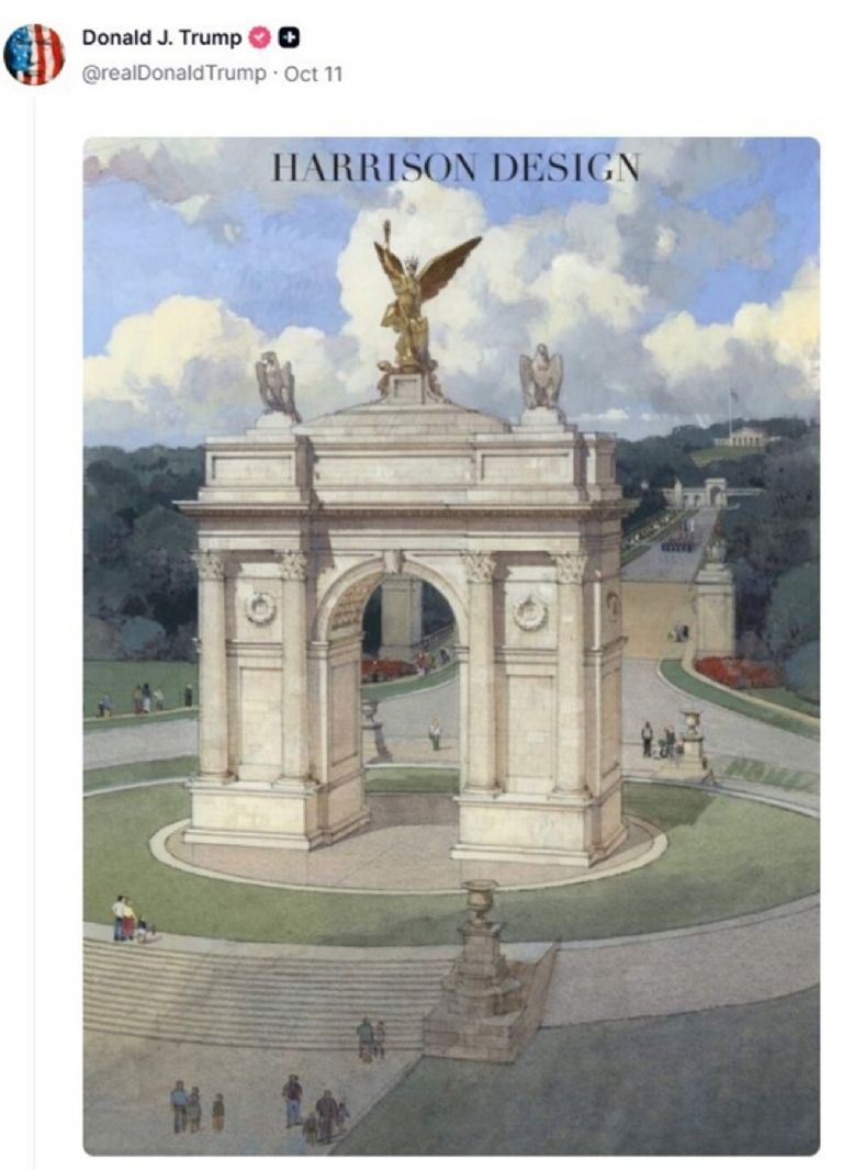Además, Trump planea construir un Arco del Triunfo en Memorial Circle, frente al Cementerio Nacional de Arlington, para conmemorar el 250 aniversario de EE.UU., una idea inspirada en el monumento de París. El arco incluiría una estatua dorada de la "Dama de la Libertad" en la cima, y encaja con la visión del presidente de imponer un estilo arquitectónico clásico en los edificios federales. No obstante, la construcción de este monumento en terreno federal está sujeta a la Ley de Obras Conmemorativas, que exige autorización del Congreso y la revisión de múltiples agencias, un proceso que la Casa Blanca parece estar omitiendo hasta el momento.
