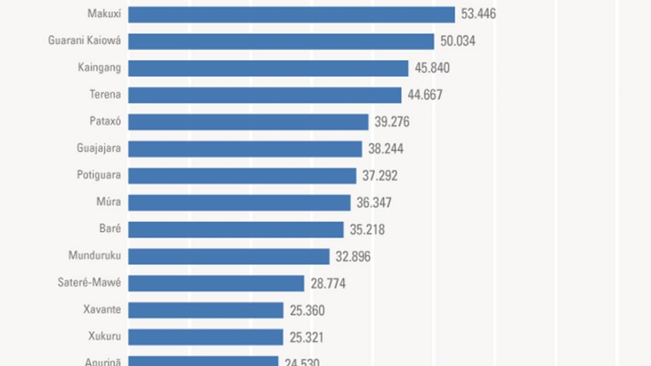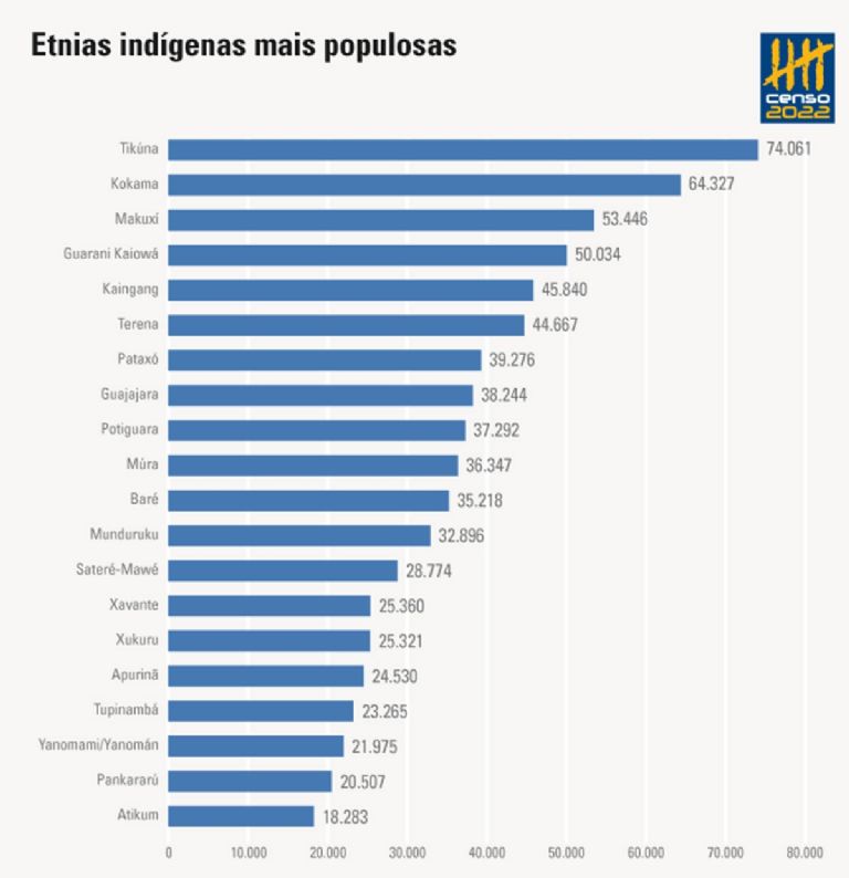 Entre las mayores etnias indígenas del país se destacan los pueblos Tikúna (74.061 personas), Kokama (64.327), Makuxí (53.446), Guaraní Kaiowá (50.034), Kaingang (45.840), Terena (44.667), Pataxó (39.276), Guajajara (38.244), Potiguara (37.292) y Múra (36.347).