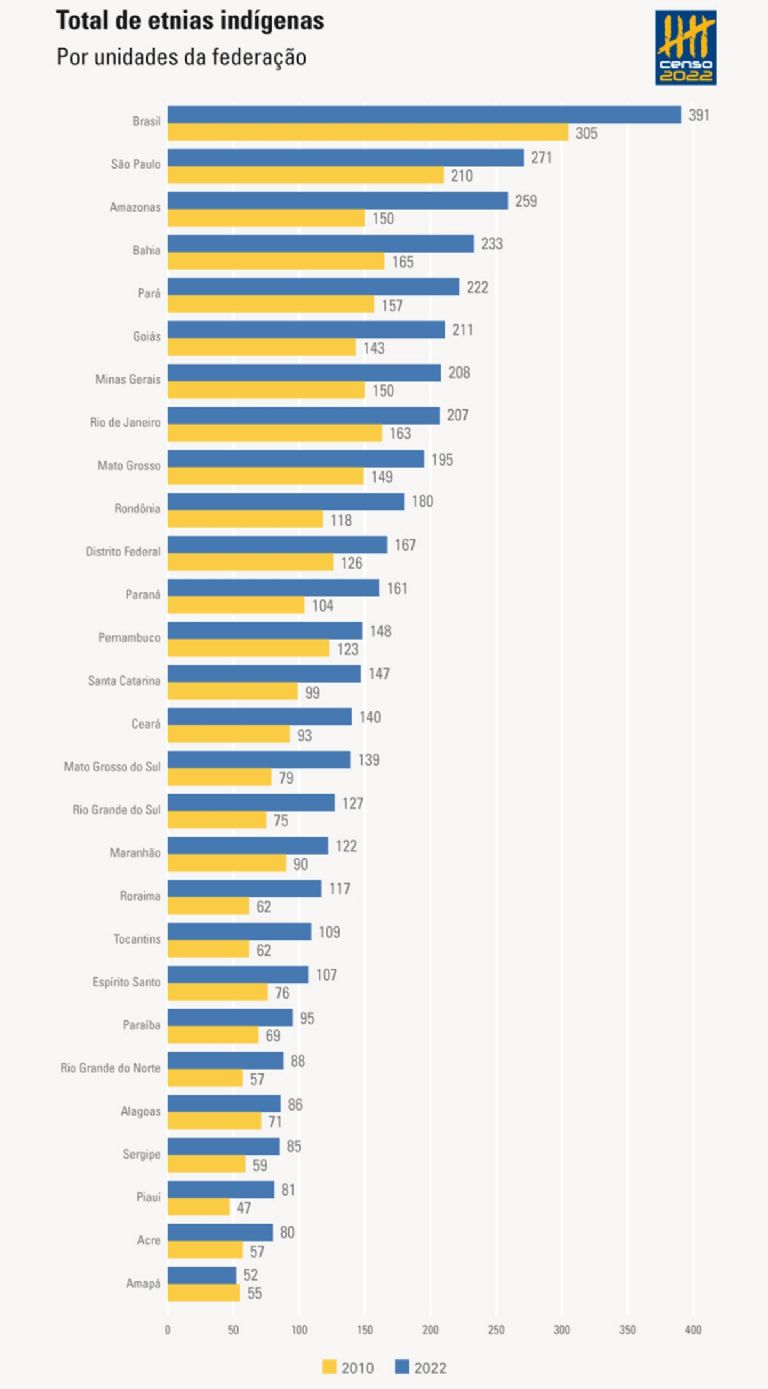 El número de pueblos y lenguas indígenas en Brasil creció significativamente en la última década, al aumentar de las 305 etnias registradas en 2010 a las 391 en 2022, mientras que las lenguas indígenas identificadas pasaron de 274 a 295 en el mismo período, informó el estatal Instituto Brasileño de Geografía y Estadística (IBGE).