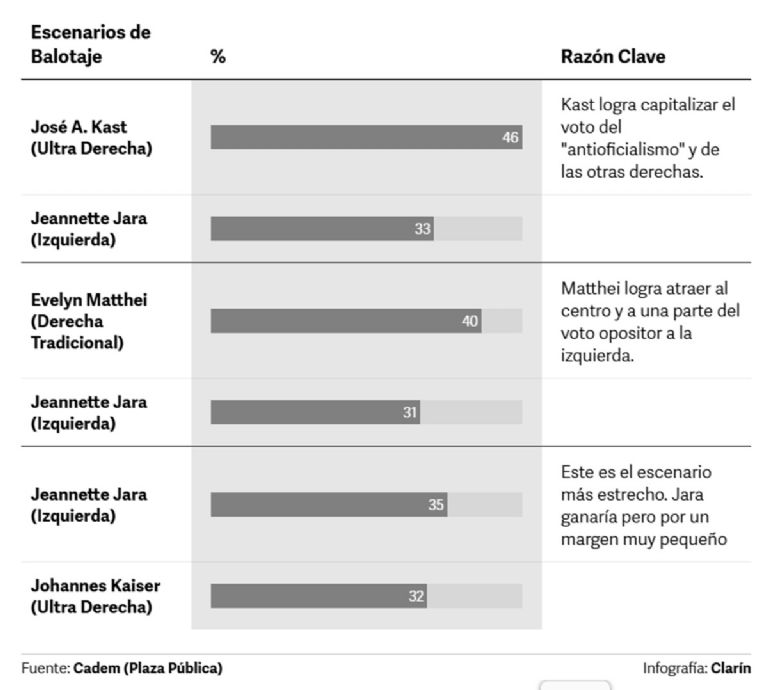 En Chile ya hay veda. Y las encuestas desaparecieron del radar. Se vota el domingo a un nuevo presidente que reemplace a Gabriel Boric. Y la campaña ya va cerrando sus últimos telones. Sin embargo, estudios publicados fuera del país vecino, con fecha al 9 de noviembre, confirman la tendencia que se venía dando: la favorita para esta primera vuelta es la candidata oficialista, Jeannette Jara, informó Clarín.
