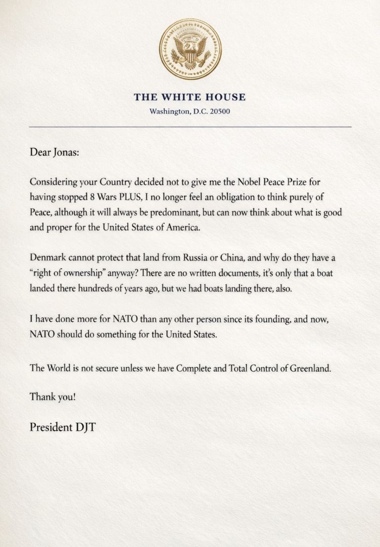 Ayer el mandatario envió una dura carta al primer ministro noruego, Jonas Gahr Støre, en la que advirtió que, al haber sido descartado por el Comité Nobel, ya no se siente “obligado a pensar únicamente en la paz”.