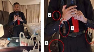 Es una foto frente al espejo de su habitación en el hotel donde luego irrumpió a los tiros. Se lo ve con una pistolera de hombro y un cuchillo enfundado. Consta en un documento presentado por la fiscalía, en el que se pide que Cole Allen siga preso a la espera del juicio.