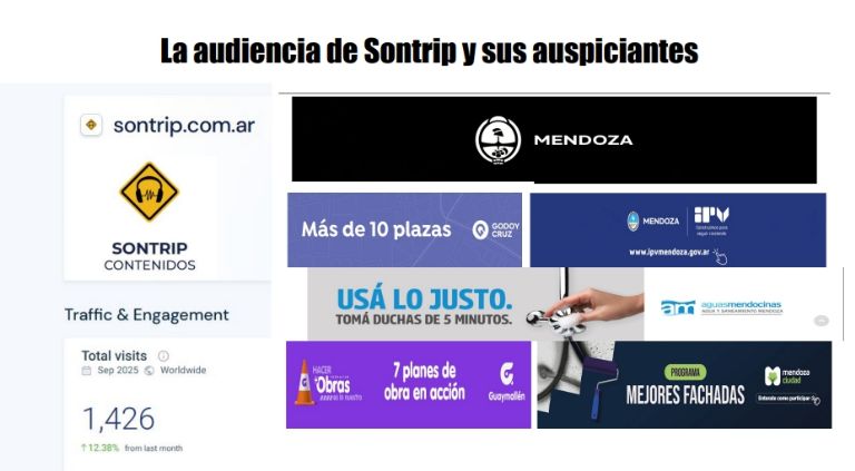 El encargado del Área de Comunicación y Prensa del Ministerio de Gobierno es director de una radio online llamada Sontrip. Además, tiene un cargo de planta reservado en Aguas Mendocinas. El portal sontrip.com.ar tiene pauta de municipios, entes descentralizados y del gobierno provincial, pero según consta en la base de datos de SimilarWeb -sitio que se encarga de relevar estadísticas de todos los portales del mundo- apenas tuvo 1.400 vistas en el mes de septiembre.