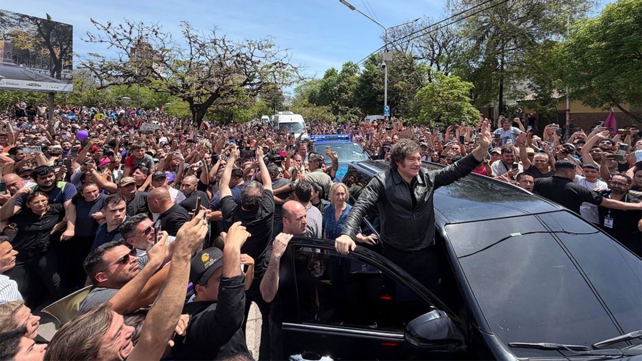 La llegada del mandatario ocurrió minutos después del mediodía, dos horas después del horario previsto y caminó entre los militantes libertarios de Chaco.