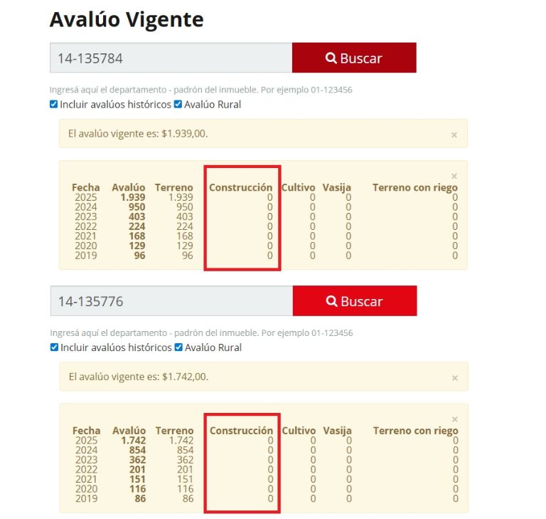 Según consta en el avalúo inmobiliario del padrón de los lotes de Rodolfo Suarez, no se ha registrado ninguna construcción. Es decir, solo está tributando en base al avalúo del terreno que está muy lejos de ser el valor de mercado. El precio real no baja de los 100 mil dólares la hectárea, pero el avalúo no llega a los 2.000 pesos.
