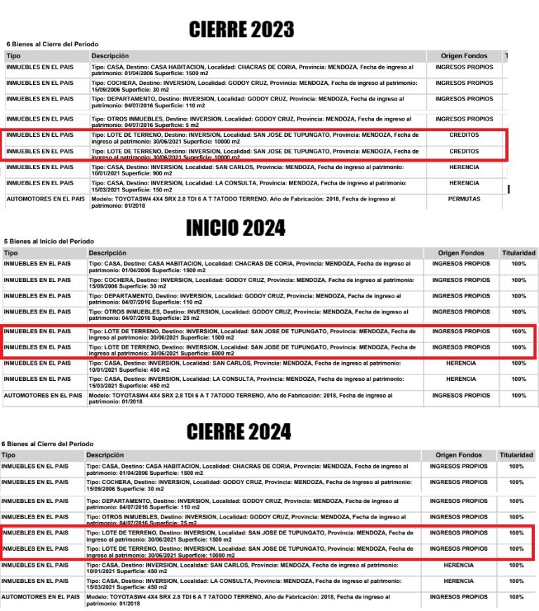 Otro dato que no está claro es cómo adquirió esos lotes que en el mercado se comercializan a valores que oscilan los 100 mil dólares por hectárea y, dependiendo de la ubicación, pueden llegar a duplicar ese valor. Según la declaración que presentó en 2023 lo hizo con un crédito, pero meses después declaró que la compra fue con ingresos propios. Pero además de ello, no hay que perder de vista que construir en esa zona de la provincia de Mendoza también tiene un costo superior a la media por las dificultades logísticas del traslado de materiales y mano de obra.
