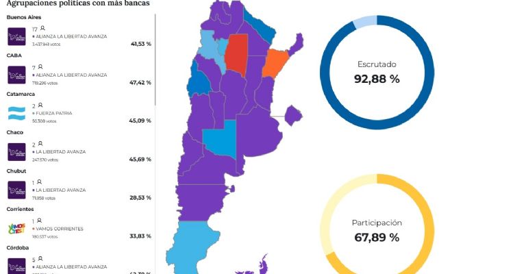 La alianza oficialista La Libertad Avanza se impuso esta noche en las elecciones legislativas para diputados con el el 40,84 por ciento de los votos, seguido por 24,50 por ciento de Fuerza Patria y el 5,12 de Provincias Unidas, escrutadas el 90 por ciento de las mesas. Así lo anunció el jefe de Gabinete, Guillermo Francos, desde el centro de cómputos en el Correo Argentino. La sorpresa la dio Diego Santilli, quien ganó en la provincia de Buenos Aires por 1%.