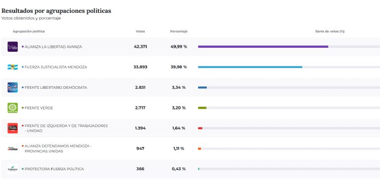 Con el 83% de las mesas escrutadas los primeros datos oficiales ubican a LLA + Cambia Mendoza con el 49% de los votos, mientras que la lista de Emir Félix cosechó el 40%.