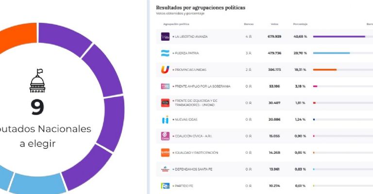 El peronismo, en tanto, llevó como cara principal a Caren Tepp, actual concejal de Rosario, y quedó segundo con el sello Fuerza Patria. Por LLA ingresarán a la Cámara cuatro legisladores, entre ellos Agustín Pellegrini; Yamile Tomassoni y Juan Pablo Montenegro.