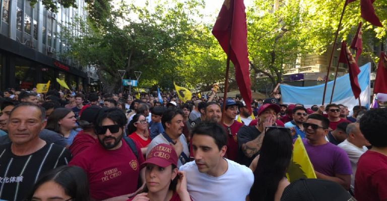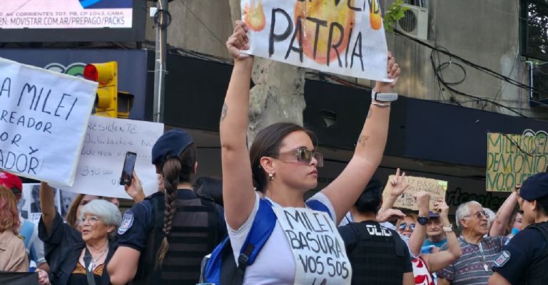 Cientos de seguidores se congregaron en la calle, armados con banderas violetas y coreando lemas a favor del mandatario. Simultáneamente, grupos opositores y jubilados se manifestaron con carteles que lo acusaban de "hambreador" y "vende patria," mencionando el escándalo del "3%" de Karina Milei.