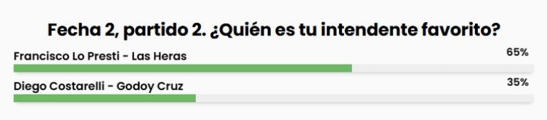 Está en marcha la segunda fecha del torneo para elegir al mejor intendente del Gran Mendoza. El cruce entre Francisco Lo Presti (Las Heras) y Diego Costarelli (Godoy Cruz) quedó en manos del lasherino que de esta forma sumó sus primeros tres puntos. Lo Presti había perdido el primer encuentro contra Marcos Calvente (Guaymallén).