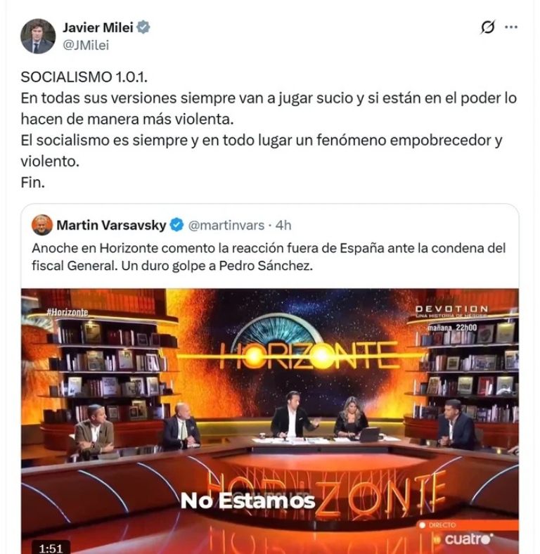 El presidente Javier Milei esta mañana reiteró sus críticas al socialismo y compartió un posteo contra el gobierno de España que encabeza Pedro Sánchez, con quien tuvo un altercado a principios de su mandato.