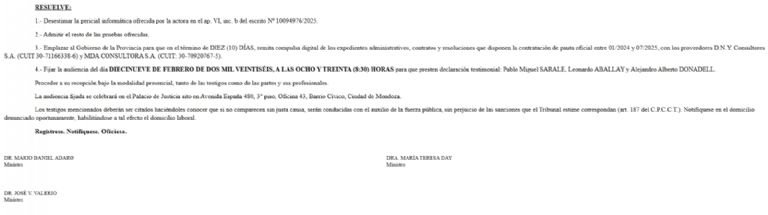 ¿Cuál es el criterio que fundamenta las contrataciones? ¿Por qué medios sin visitas reciben millones de pesos? ¿De que forma se acredita la causal de la erogación? Esas son algunas de las preguntas que podrían encontrar respuesta en esta causa. La Corte le dio lugar al pedido y emplazó al Poder Ejecutivo del Gobierno de Mendoza para que remita compulsa digital de los expedientes administrativos, contratos y resoluciones, debidamente motivadas, que disponen la contratación de pauta oficial entre 01/2024 y 07/2025, con los proveedores D.N.Y. Consultores S.A. y MDA CONSULTORA S.A. Y además de ello cita a declaración testimonial a Pablo Miguel Sarale, Leonardo Aballay y Alejandro Alberto Donadell.