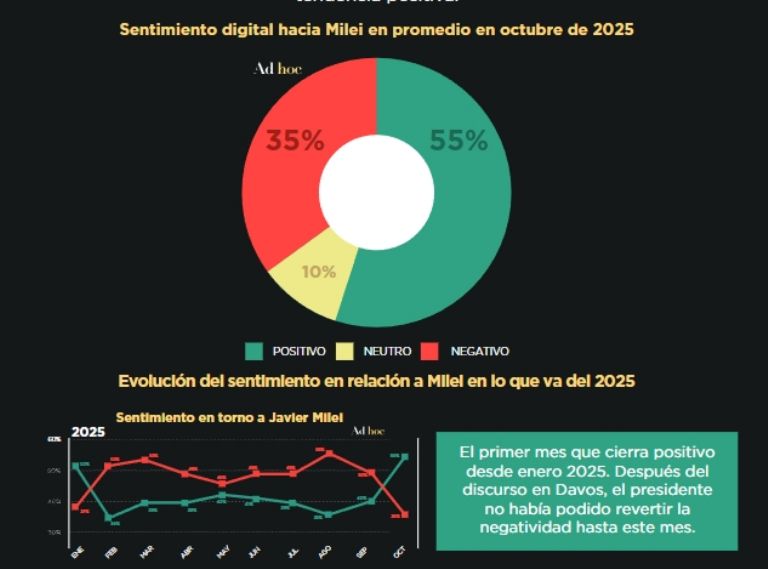 El presidente Javier Milei logró revertir durante octubre la tendencia a la baja en su imagen en redes sociales, tras ocho meses consecutivos de negatividad.
