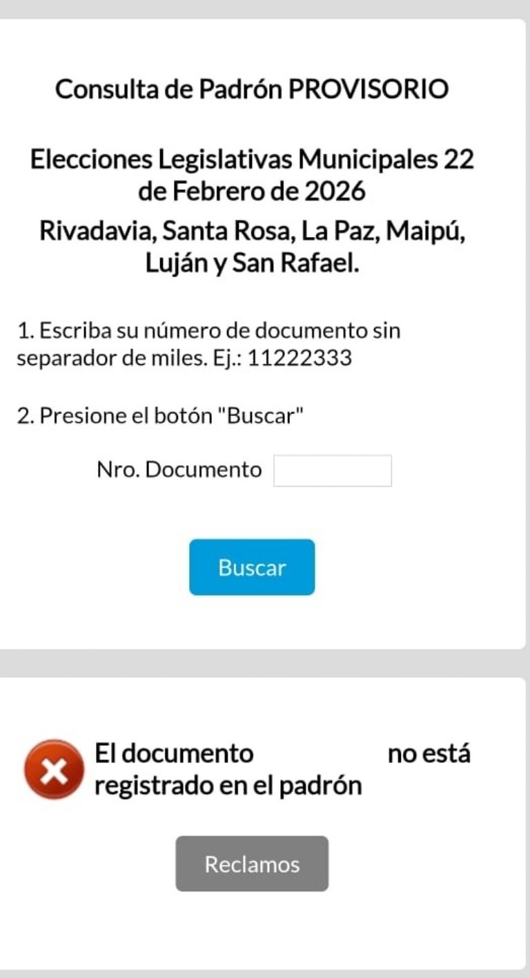 El link para hacer consultas y reclamos es padrón.mendoza.gov.ar en el que solo hay que colocar el número de documento. La búsqueda informa si el documento figura en el padrón y en qué departamento. En caso de no figurar en el padrón, aparece la opción para realizar el reclamo correspondiente.