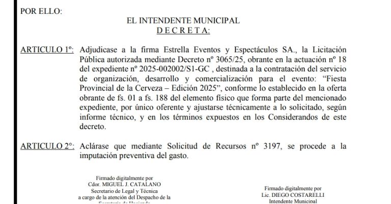 Paralelamente, el municipio avanzó con la adjudicación de la edición 2025 de la Fiesta de la Cerveza a la empresa Estrella Eventos y Espectáculos. El evento tendrá lugar el 5, 6 y 7 de diciembre y la productora se hará cargo de la contratación de artistas, los gastos de viajes aéreos y terrestres, alojamientos en hoteles 5 y 4 estrellas, viáticos, catering para el día de la prueba de sonido y show, traslados internos y seguros pertinentes.