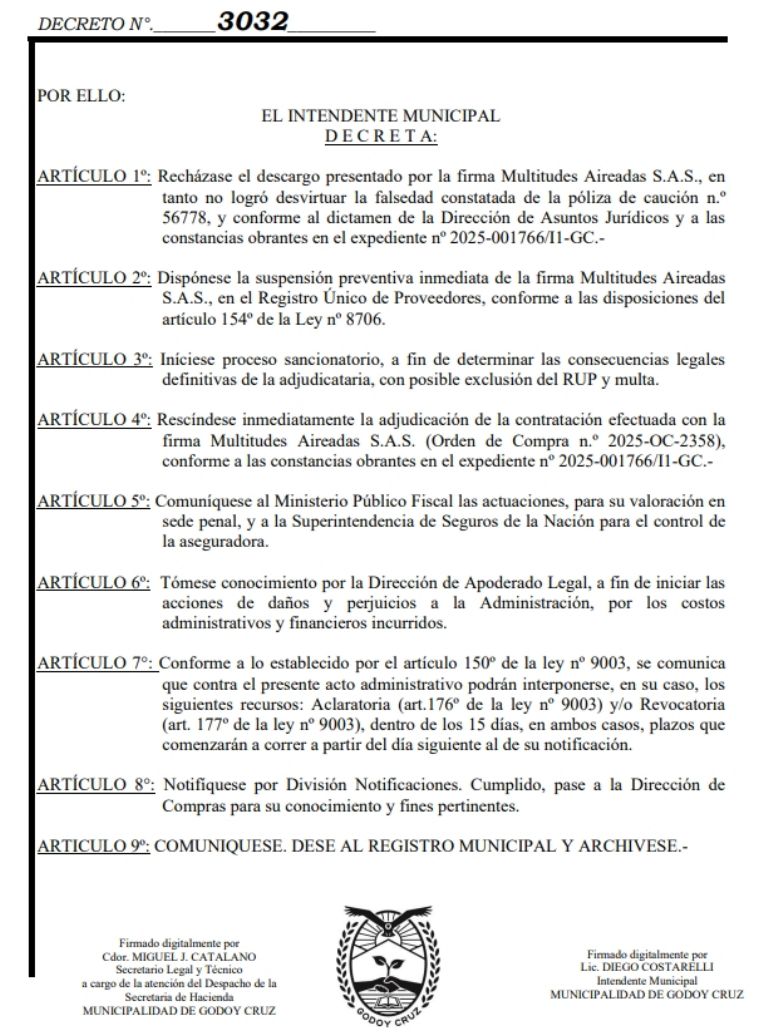 A raíz de ello, se inició una causa por falsificación o adulteración de documento privado en la Unidad Fiscal de Delitos no Especializados. "Dicho proceso se encuentra orientado a la investigación sobre la presunta utilización de una póliza apócrifa", manifestó Diego Costarelli en el decreto mediante el cual determina la rescisión del contrato. Incluso, dispuso la suspensión preventiva inmediata de Multitudes Aireadas del Registro Único de Proveedores.