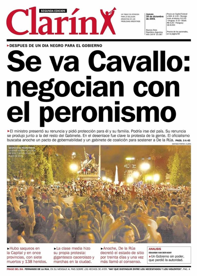 El ruido de las cacerolas hizo que renunciara el entonces ministro de Economía, Domingo Cavallo, el 19 de diciembre de 2001. Al otro día, después de decretar el estado de sitio y de que fallecieran 39 personas en las distintas manifestaciones, renunció el presidente Fernando De la Rúa y se sucedieron 5 presidentes en 11 días (Fernando De la Rúa, Ramón Puerta, Adolfo Rodríguez Saá, Eduardo Camaño y Eduardo Duhalde).