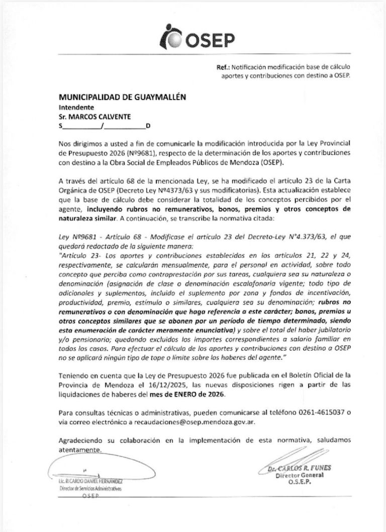 El Presupuesto 2026 autorizó un cambio en la forma de cálculo del descuento por bono de sueldo y se tomará como base la totalidad de los haberes. Anticipan acciones judiciales.Ayer el exsenador Marcelo Romano denunció públicamente un aumentazo encubierto en el aporte social de los empleados estatales a OSEP. "Si sos empleado público de Mendoza y tenés OSEP te tengo una mala noticia. El Gobierno de Cornejo ordenó cambiar la forma de cálculo de ese descuento que te hacen de la obra social", manifestó. Este viernes el exdiputado Mario Vadillo denunció que "OSEP no puede ajustar el sueldo del trabajador para tapar salarios pagados en negro". El abogado especializado en defensa del consumidor advirtió que los nuevos descuentos incorporados en el Presupuesto 2026 carecen de sustento legal y contradicen el régimen nacional de obras sociales y la jurisprudencia de la Corte Suprema.