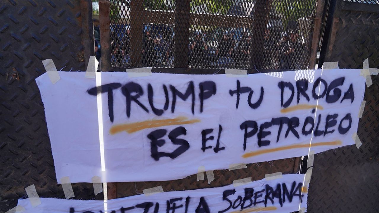 Durante la protesta pudieron observarse pancartas y banderas contra el gobierno estadounidense, una de las cuales decía “Trump tu droga es el petróleo” y “Fuera yanquis de Latinoamérica”.