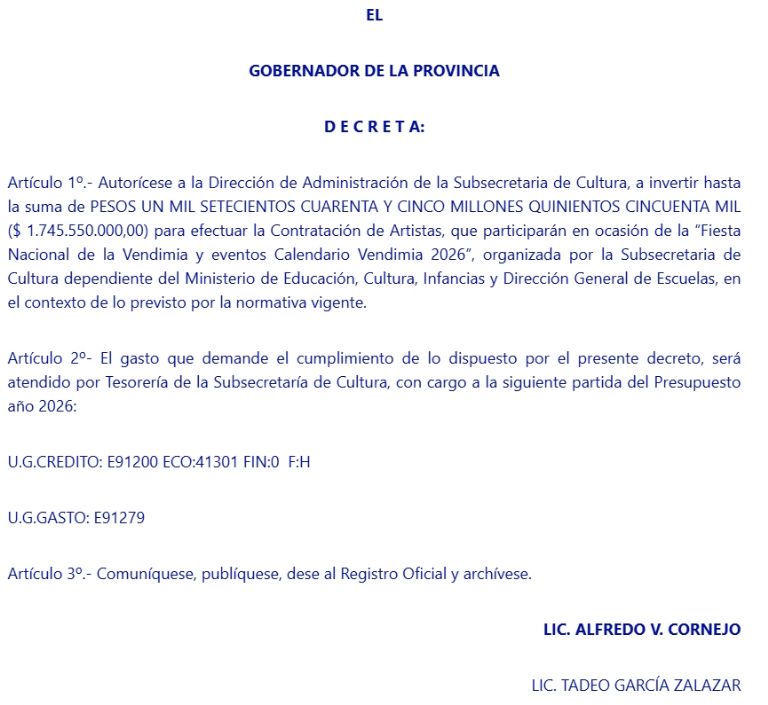 "Autorícese a la Dirección de Administración de la Subsecretaria de Cultura, a invertir hasta la suma de $ 1.745.550.000,00 para efectuar la Contratación de Artistas, que participarán en ocasión de la 'Fiesta Nacional de la Vendimia y eventos Calendario Vendimia 2026', organizada por la Subsecretaria de Cultura", se puede leer en el decreto.