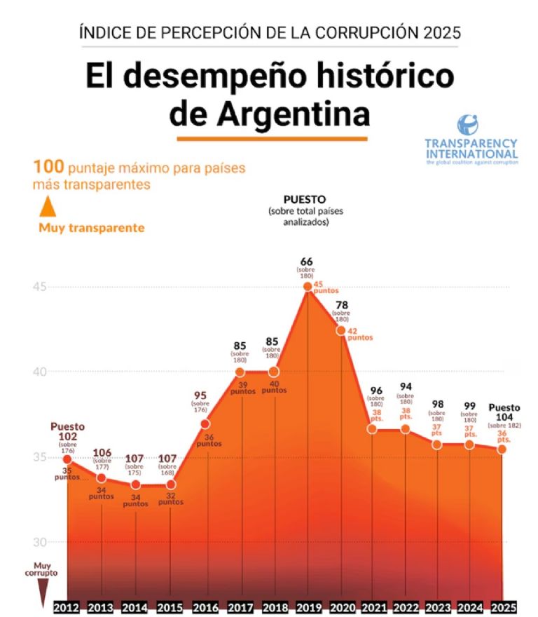 Quedó en el puesto 104 sobre 182 países, cuando el año anterior se había ubicado en el 99. Obtuvo 36 puntos sobre 100 del país más transparente, según Transparencia Internacional.Pese al discurso contra la “casta política” y sus “prácticas corruptas” del presidente Javier Milei, en su segundo año de gestión, Argentina retrocedió cinco lugares en el Índice de Percepción de la Corrupción 2025. Se trata de una medición que hace anualmente la ONG Transparencia Internacional, líder en esta materia.