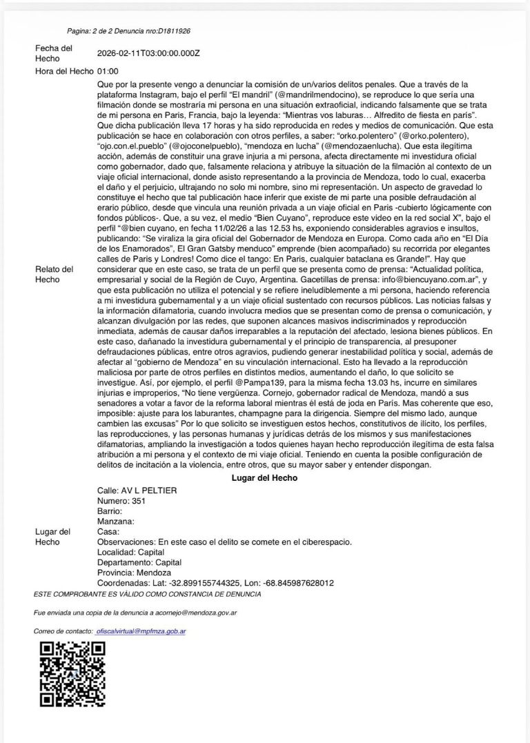 “El video en cuestión fue grabado en Mendoza, en un espacio abierto y habilitado. No fue en París, como maliciosamente se intenta hacer creer. Es una mentira deliberada”, aclaró Alfredo Cornejo.