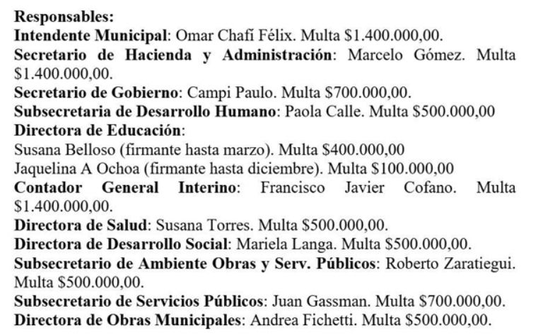 Específicamente se aplicaron multas de 1.400.000 pesos al intendente Omar Félix, al secretario de Hacienda Marcelo Gómez y al contador General Francisco Javier Cofano. Pero al mismo tiempo se multó también otros funcionarios municipales que participaron en los procesos de contratación por Legítimo Abono.