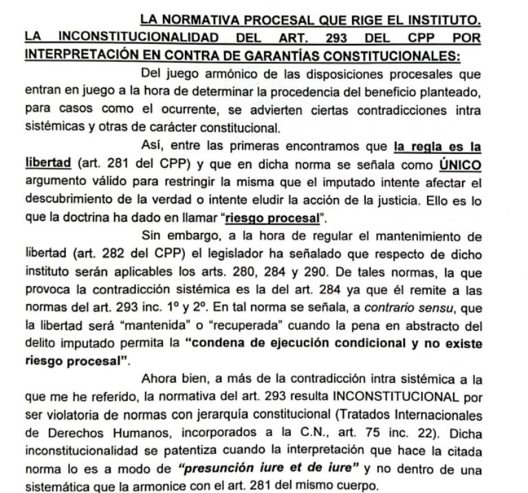 "En caso de que la norma fuera interpretada como una presunción iuris tantum, es decir, en el sentido armónico de que no siempre que no proceda la condenación condicional será menester el encierro durante el proceso, el planteo deviene abstracto desde que no genera agravio constitucional alguno", aclaran los letrados dejando en evidencia la ambigüedad que ha generado la norma afectando de forma desigual a personas investigadas por hechos similares.