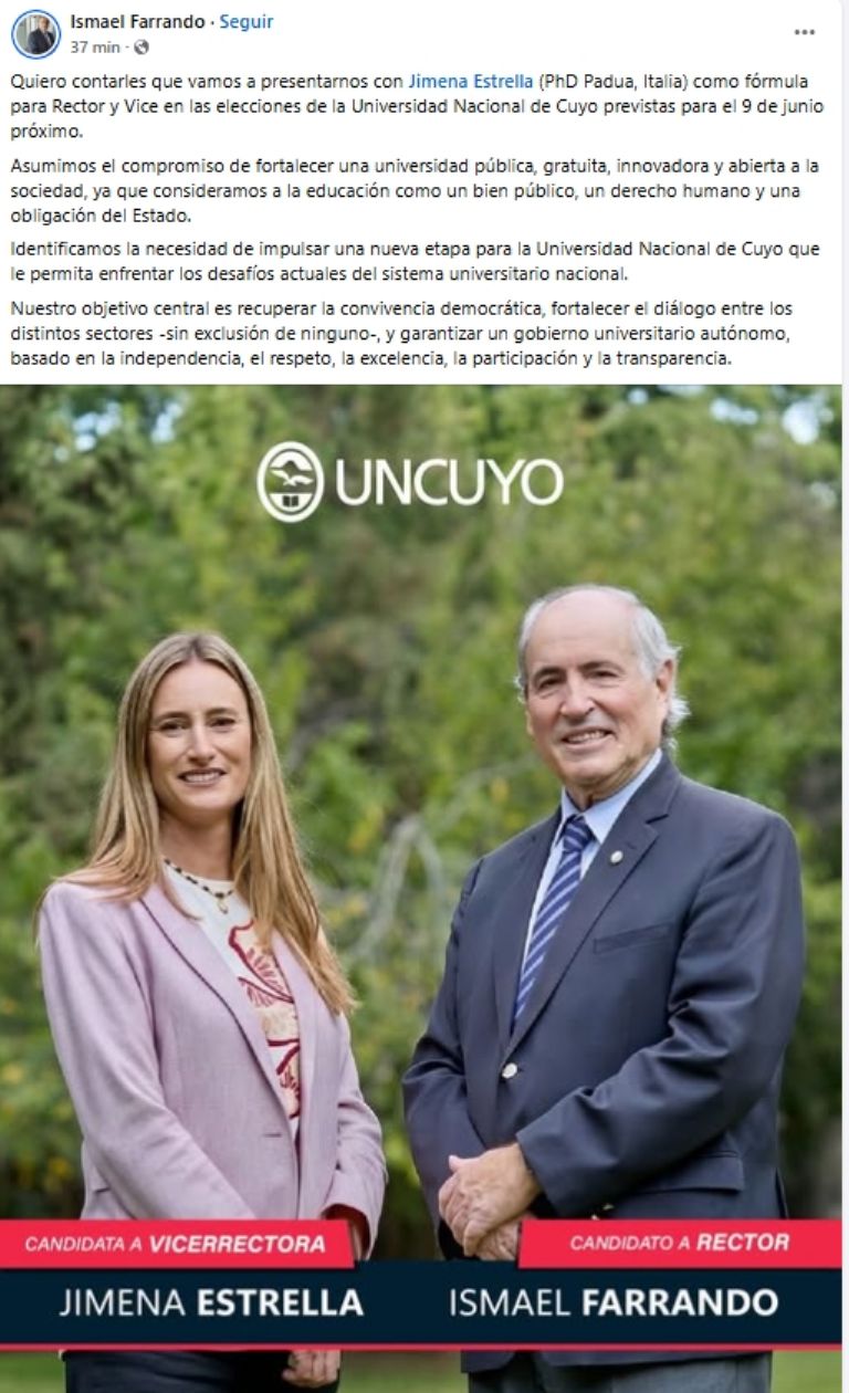 "Quiero contarles que vamos a presentarnos con Jimena Estrella (PhD Padua, Italia) como fórmula para Rector y Vice en las elecciones de la Universidad Nacional de Cuyo previstas para el 9 de junio próximo", manifestó en las redes sociales. Allí afirmó que se presentan "con el compromiso de fortalecer una universidad pública, gratuita, innovadora y abierta a la sociedad, ya que consideramos a la educación como un bien público, un derecho humano y una obligación del Estado".