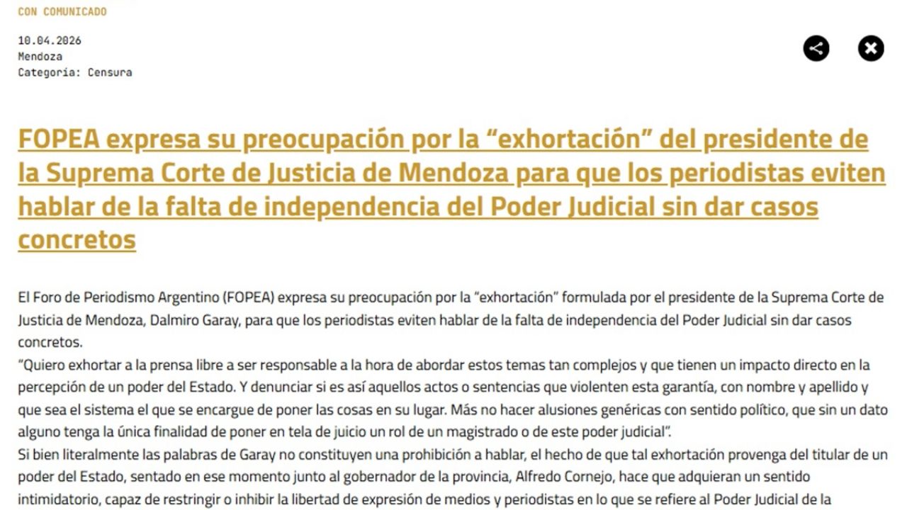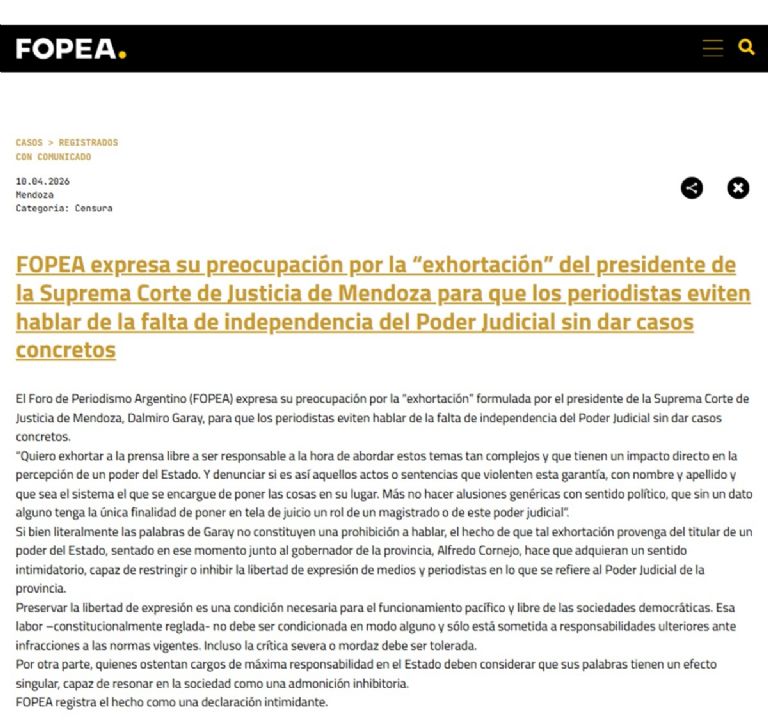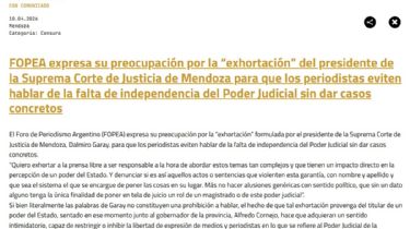 No fue menor lo que sucedió la semana pasada cuando el Foro de Periodismo Argentino (Fopea), mediante un comunicado, expresó su preocupación por la “exhortación” formulada por el presidente de la Suprema Corte de Justicia de Mendoza, Dalmiro Garay, para que los periodistas eviten hablar de la falta de independencia del Poder Judicial sin dar casos concretos.