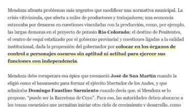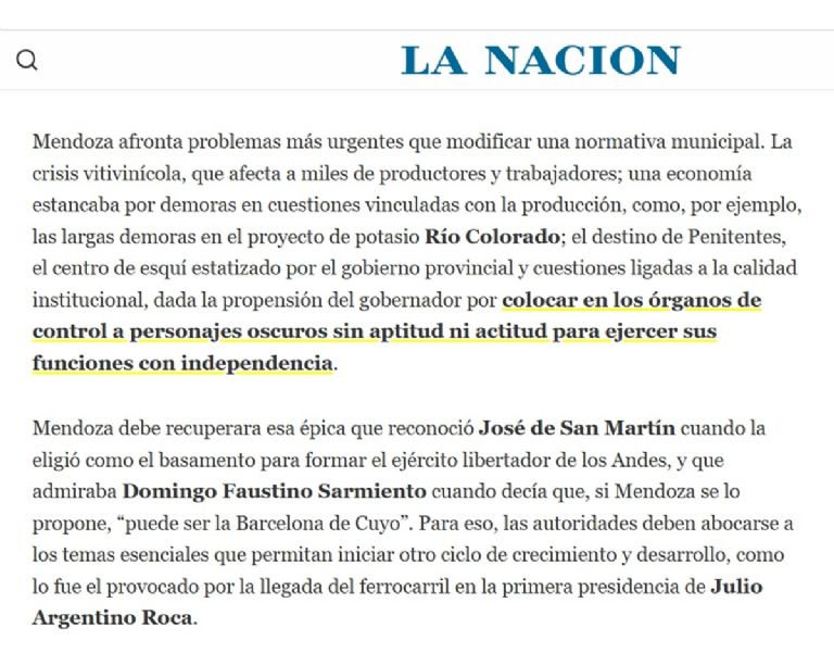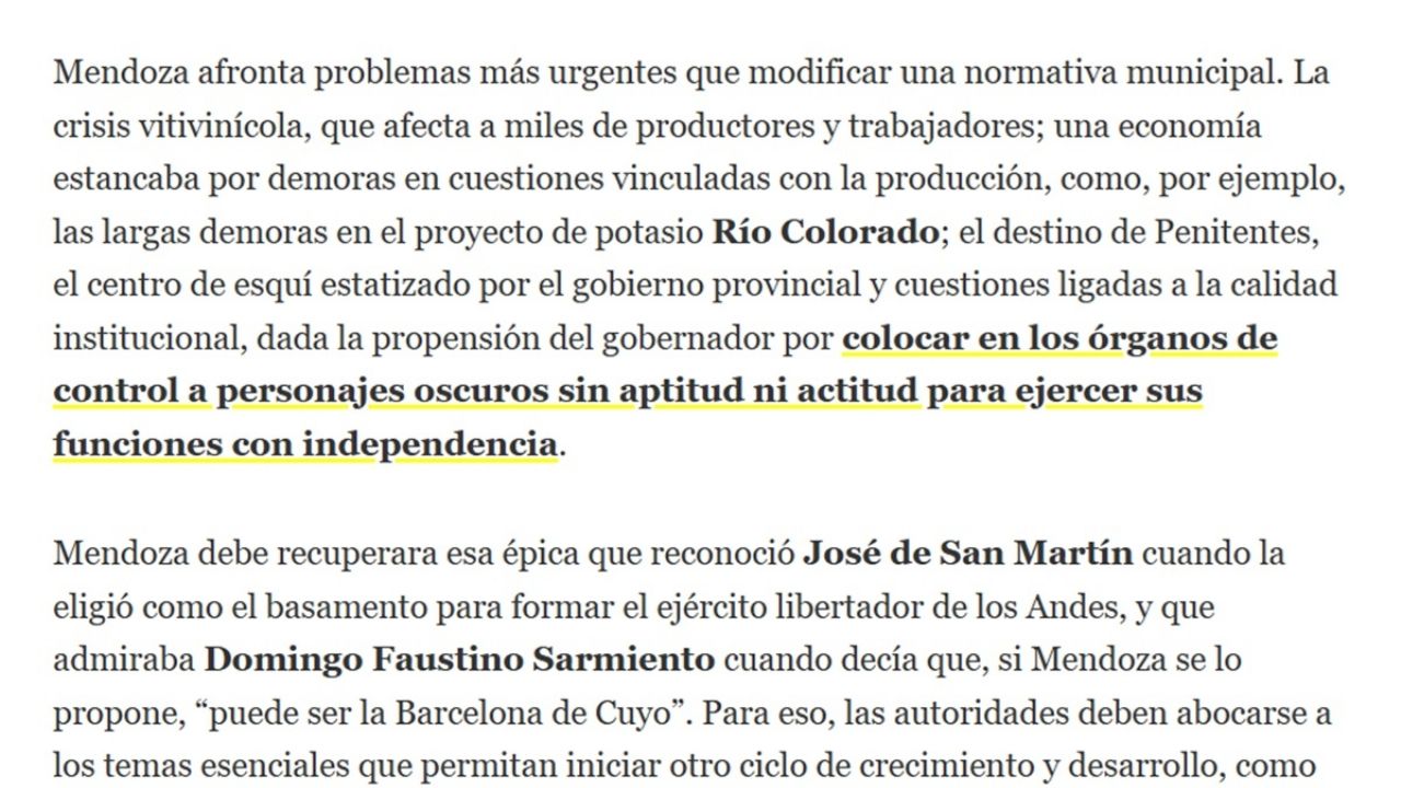 "Mendoza afronta problemas más urgentes que modificar una normativa municipal. La crisis vitivinícola, que afecta a miles de productores y trabajadores; una economía estancaba por demoras en cuestiones vinculadas con la producción, como, por ejemplo, las largas demoras en el proyecto de potasio Río Colorado; el destino de Penitentes, el centro de esquí estatizado por el gobierno provincial y cuestiones ligadas a la calidad institucional, dada la propensión del gobernador por colocar en los órganos de control a personajes oscuros sin aptitud ni actitud para ejercer sus funciones con independencia".