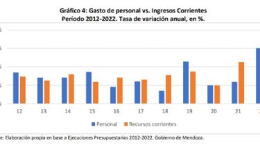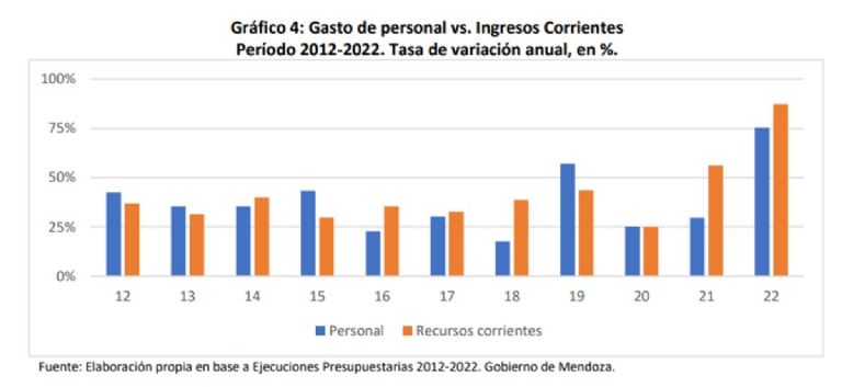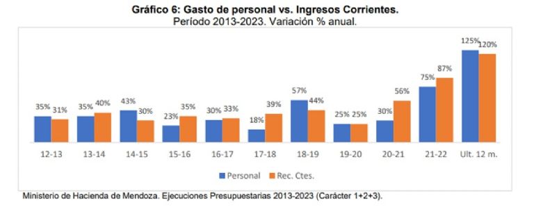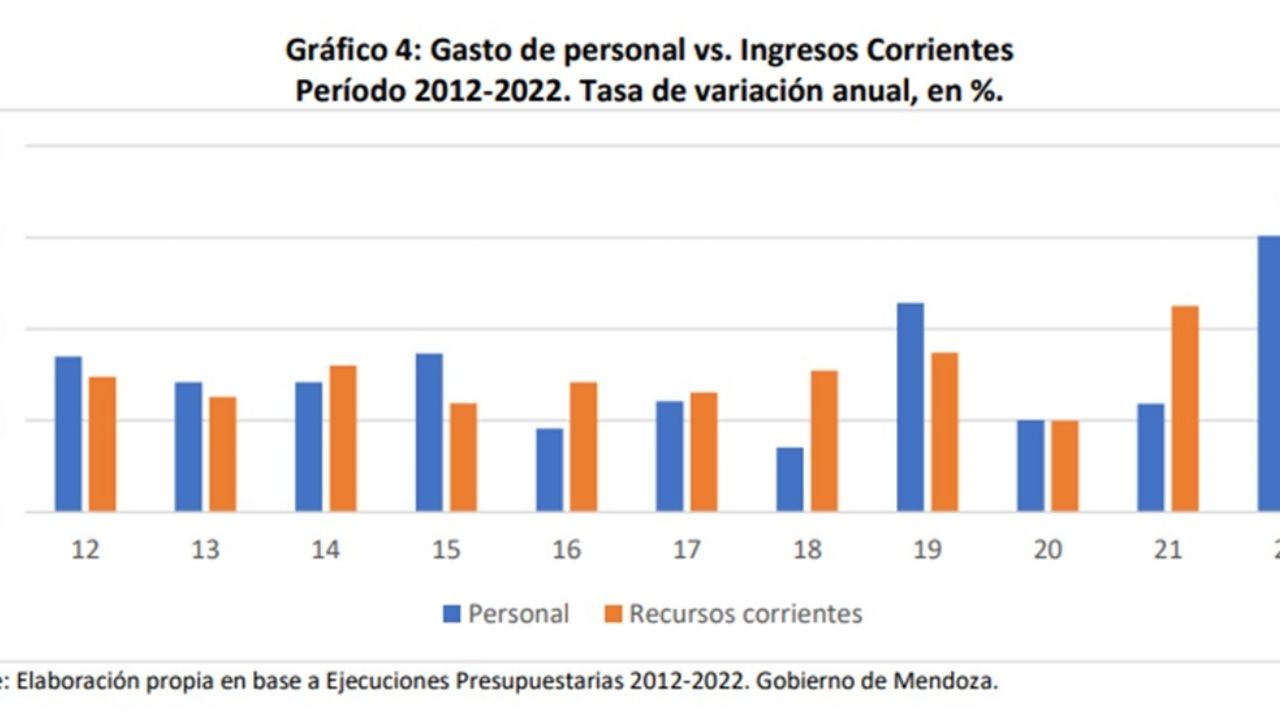 Aquí el CEM muestra el gasto de personal vs los ingresos corrientes. En el 2019, año electoral, superó el gasto en personal al ingreso corriente y en el 2020 quedó empatado, pandemia de por medio. Una de las explicaciones es que la administración Cornejo accedió a la cláusula gatillo y de esa forma los salarios públicos se actualizaban por inflación. Lo cierto es que llegó Suárez y le dijeron "no hay plata".