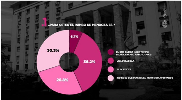 Cuando se consulta sobre el rumbo de Mendoza, el 36% dice que es una pesadilla, el 30,3% que no es lo que imaginaba, 26,8% que es el rumbo que votó y el 6,7% dice que es el que quería hace tiempo aunque no lo haya votado.