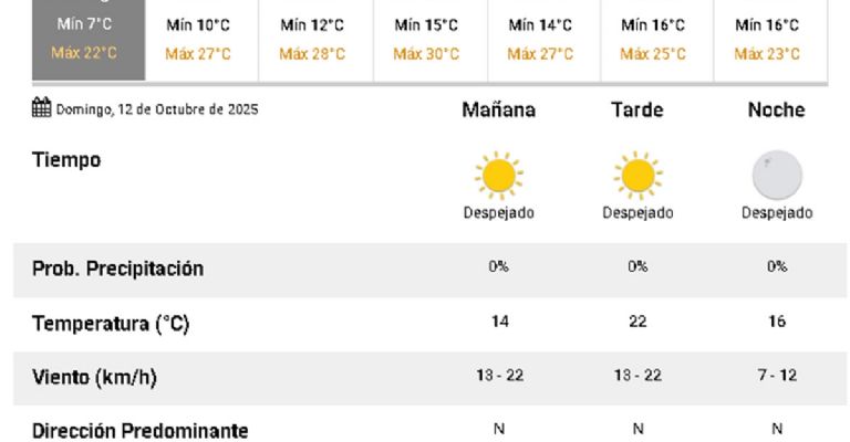 - Lunes 13: el cielo estará despejado y el termómetro escalará hasta los 26°C de máxima, con una mínima de 14°C. Será un día de pleno sol y sin probabilidad de lluvia.