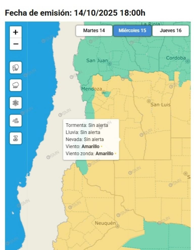 En tanto, el Servicio Meteorológico Nacional lanzó dos alertas amarillas para la provincia. Una por viento Zonda en el Sur y Oeste de Mendoza y una por vientos fuertes en el Sur y Este.