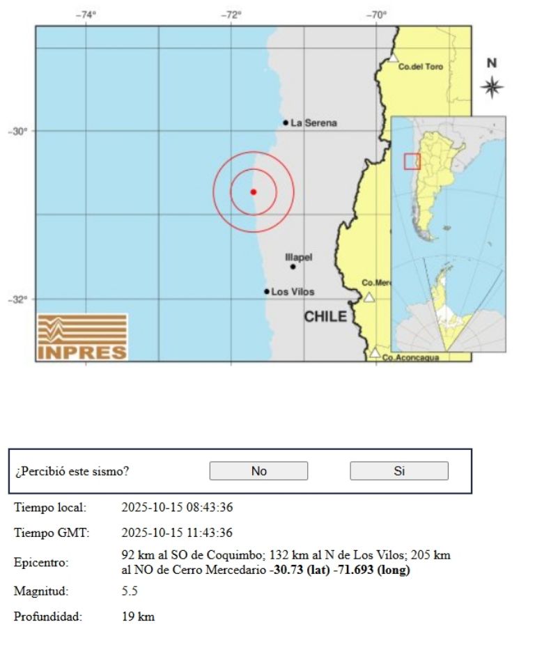 Un nuevo temblor de magnitud 5.8 sacudió la región de Coquimbo, a solo 99 kilómetros de La Serena, y generó reportes de percepción en varios puntos de la provincia de Mendoza.