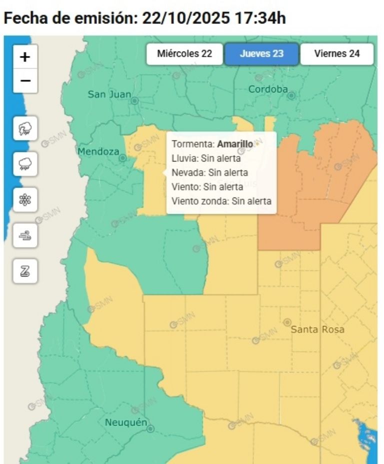 En tanto, el Servicio Meteorológico Nacional lanzó dos alertas amarillas para la provincia. Una por viento Zonda en el Malargüe y otra por tormentas en el Noreste de la provincia.