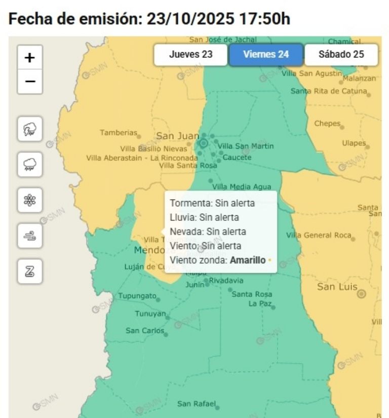 Por otra parte, el Servicio Meteorológico Nacional lanzó una alerta amarilla por Zondapero en la zona de Luján de Cuyo.
