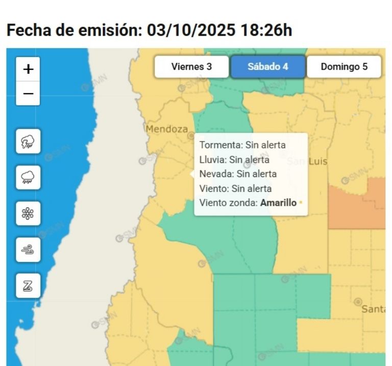 El SMN mantiene una alerta amarilla por Zonda en el Sur y en el Norte del Gran Mendoza. En el Sistema de Alerta Temprana del SMN el color amarillo indica: posibles fenómenos meteorológicos con capacidad de daño y riesgo de interrupción momentánea de actividades cotidianas.