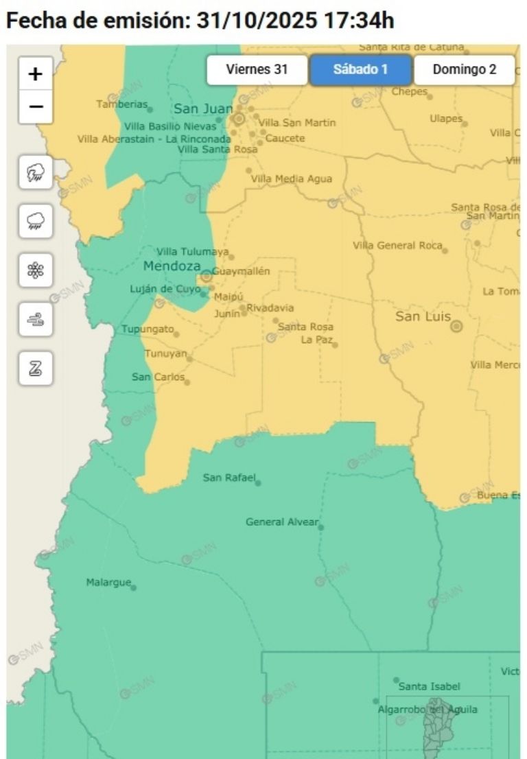 En tanto, el SMN mantiene dos alertas amarillas para la provincia: una por tormentas en el centro y Este de Mendoza y una por vientos fuertes en el Noreste.