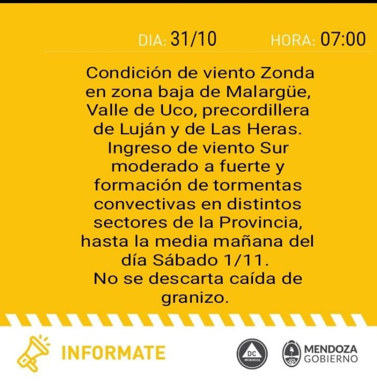 Sin embargo, hacia la tarde se espera la llegada de viento Zonda. El SMN ha emitido una alerta amarilla que afecta principalmente la precordillera y el departamento de Malargüe. Se esperan ráfagas alcancen los 75 km/h a partir de la tarde, lo que puede provocar reducción de la visibilidad por polvo, aumento súbito de la temperatura y humedad muy baja.