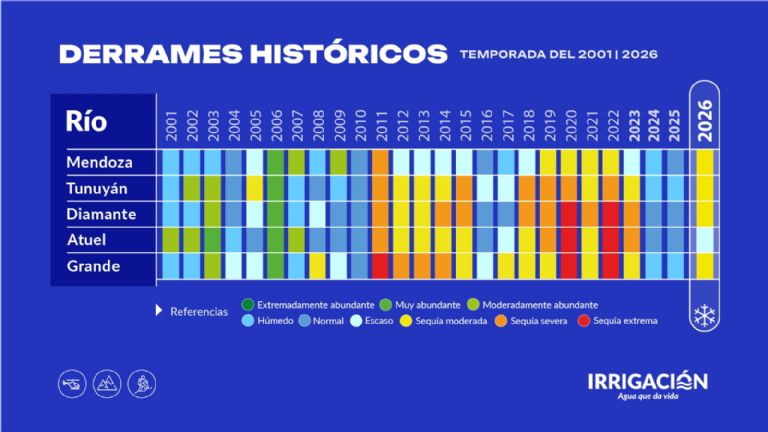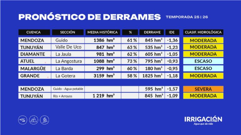 El año medio es 1.386 hm³ en ése río e Irrigación pronosticó para el Mendoza 845 hm³. De esos 845 hm3 hay que descontarle más de 250 hm3 para consumo de agua potable. “El volumen de agua que queda para la el resto de los usos indica que va a estar en un nivel de sequía hidrológica severa”, indicó Rubén Villodas, gerente de Gestión Hídrica de Irrigación. Los otros usos son riego agrícola, cinturón verdes, industrias, entre otros.